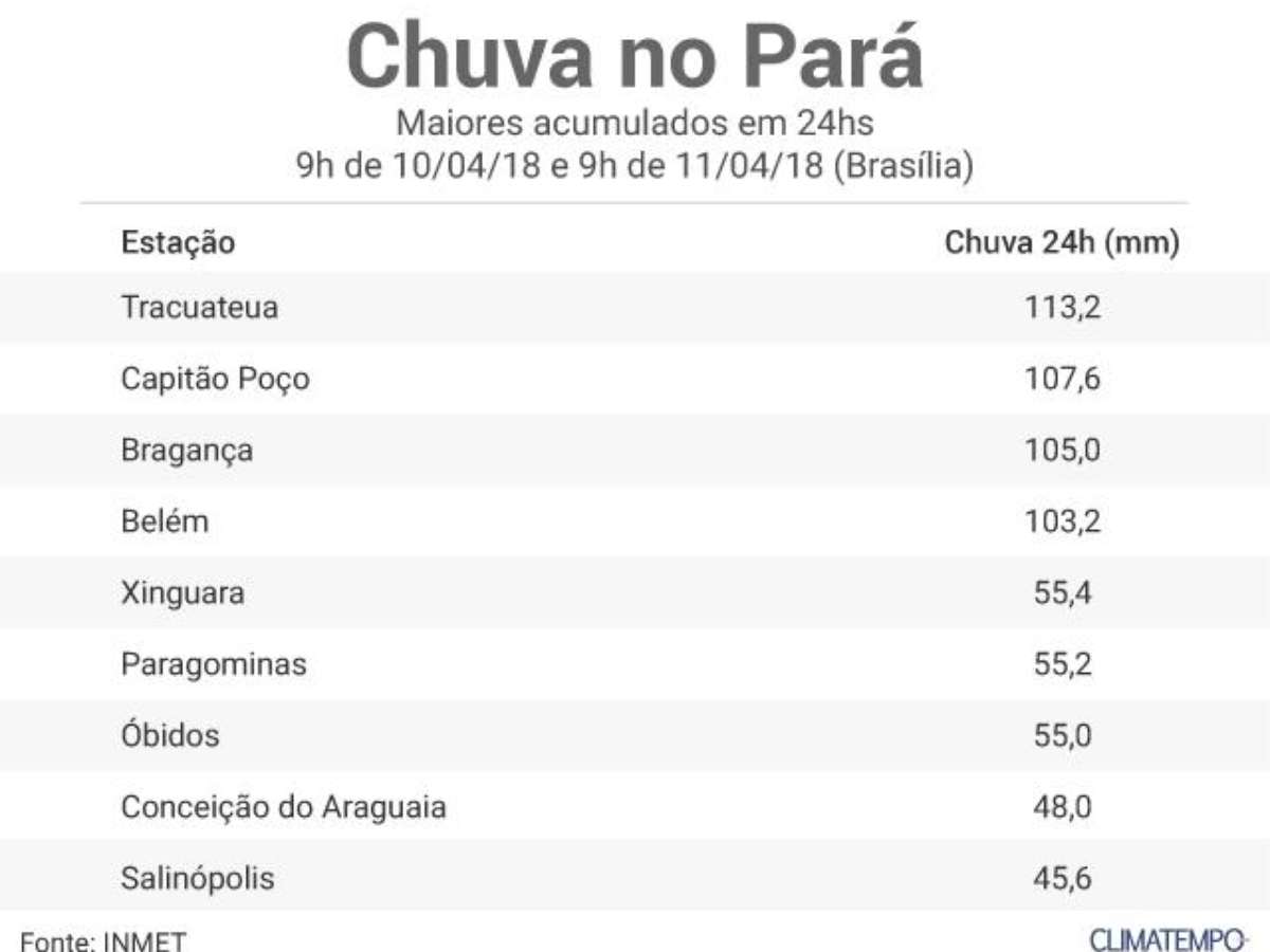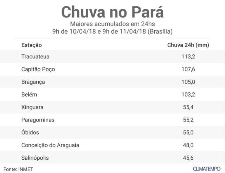 Áreas de instabilidade que continuam ativas sobre o Pará provocaram volumes expressivos de chuva no estado. Dados da estação automática do Inmet - instituto Nacional de Meteorologia registraram no período entre 9h do dia 10/04 até 9h do dia 11/04, um acumulado de chuva de 103,2 milímetros em Belém. O município de Tracuateua, registrou o maior volume de chuva no estado. Foram acumulados 113,2 milímetros. Observe no quadro abaixo os maiores volumes acumulados nas últimas 24 horas: