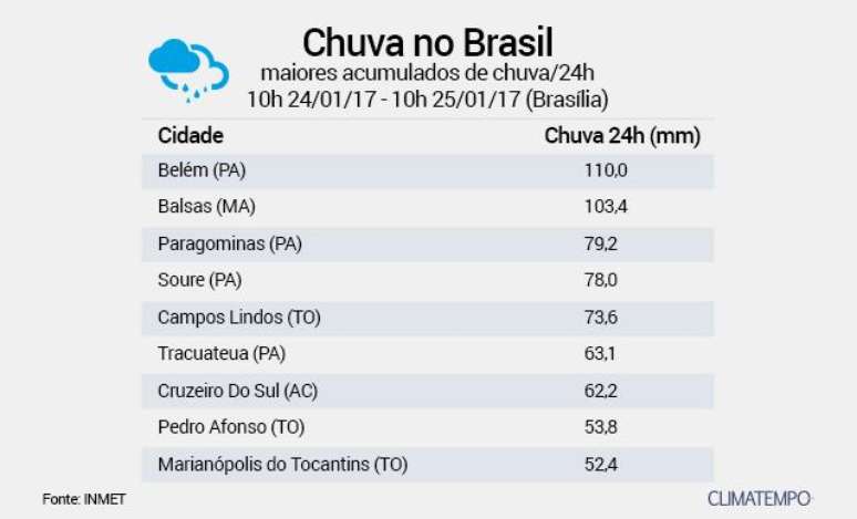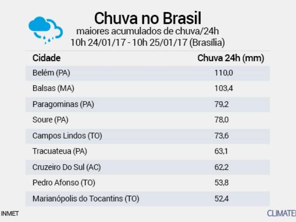 Belém, a capital do Pará, registrou o maior volume de chuva no Brasil entre 10h do dia 24 e 10h de 25 de janeiro, de acordo com o INMET - Instituto Nacional de Meteorologia. Na medição automática, o total acumulado neste período foi de 110 mm.
