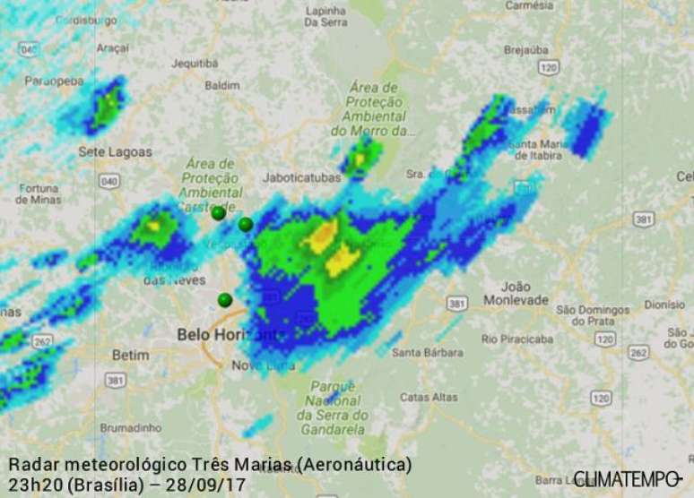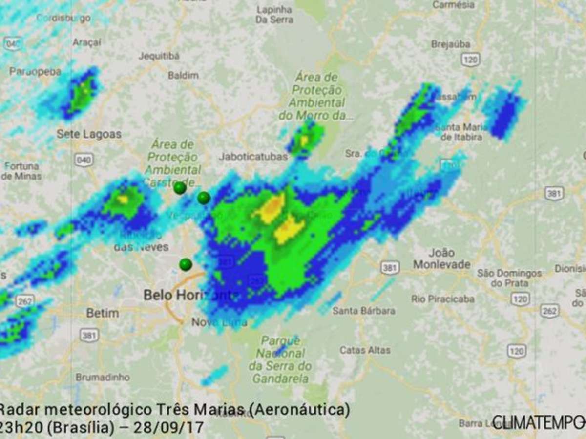 Por volta das 16h, radares meteorológicos do sistema REDEMET - Rede de Meteorologia do Comando da Aeronáutica - já reportavam pancadas de chuva na Grande Belo Horizonte. Às 23 horas, o tempo ainda estava instável no aeroporto internacional de Confins, na cidade de Confins, com a presença de trovoadas.