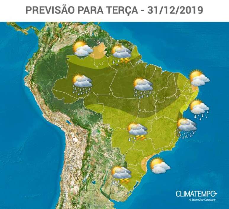 Não há expectativa de entrada de nenhuma frente fria no Brasil no último dia de 2019, mas com a grande disponibilidade de calor e de umidade, nuvens carregadas crescem ao sobre praticamente todo o país e provocam pancadas de chuva com raios, especialmente durante a tarde à noite.