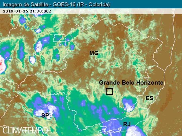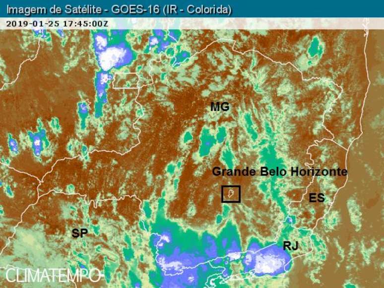 A imagem das nuvens sobre a região captada pelo satélite GOES 16 às 15h45 de 25/1/19 mostra que toda a região da Grande Belo Horizonte continuava com poucas nuvens. A nebulosidade de chuva aparece como manchas azuis, verdes, esbranquiçadas e em vermelho. As áreas com poucas nuvens aparecem em tom de marrom.