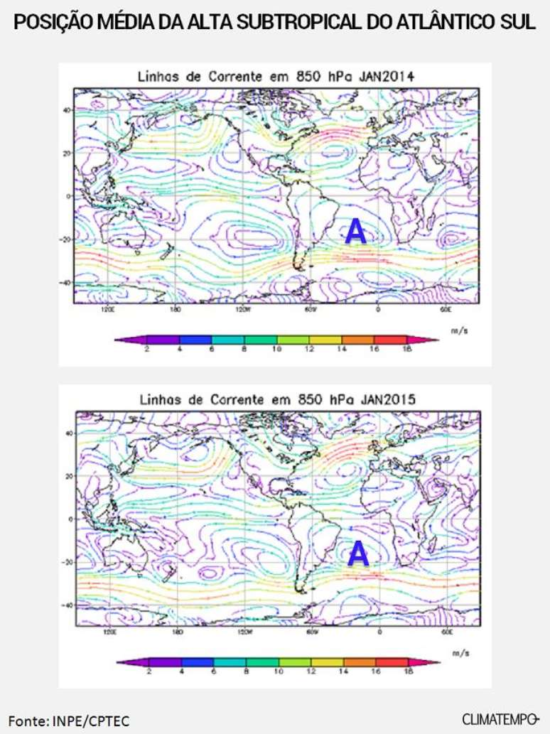 Nos mapas de linha de corrente no nível de pressão de 850 hPa (aproximadamente 1500 metros acima do nível do mar) é possível ver a posição média do grande sistema de alta pressão atmosférica do Atlântico Sul (ASAS) marcada com a letra A em janeiro de 2015 e em janeiro de 2014.