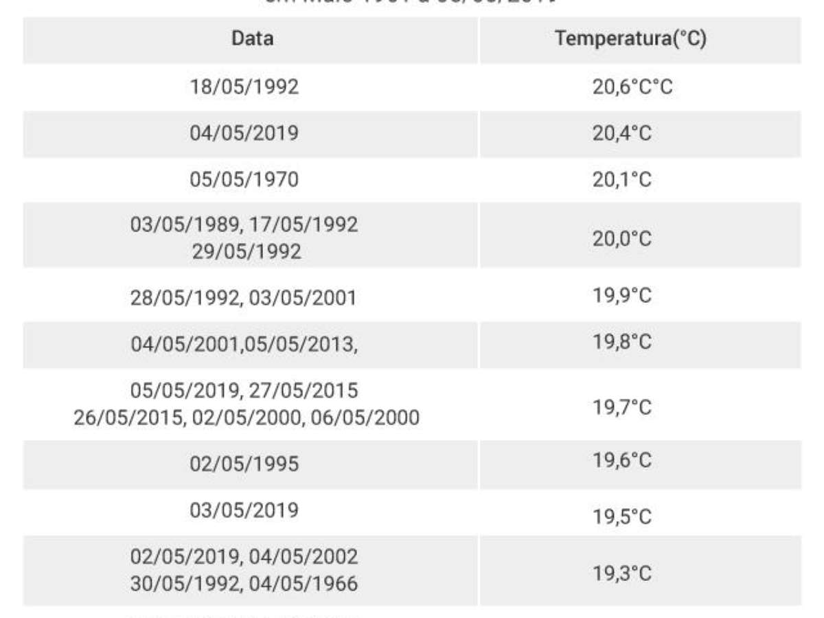 Em Porto Alegre, a temperatura mínima desta segunda-feira, 6 de maio, foi a segunda mais alta para um dia de maio para todo o período de 1988 a 2019. O Instituto nacional de meteorologia registrou 21,4°C que também ocorreu em 29/5/1991. O recorde de maior temperatura mínima em maio do período de 1988 a 2019 é de 22,6°C, em 28/5/2019.