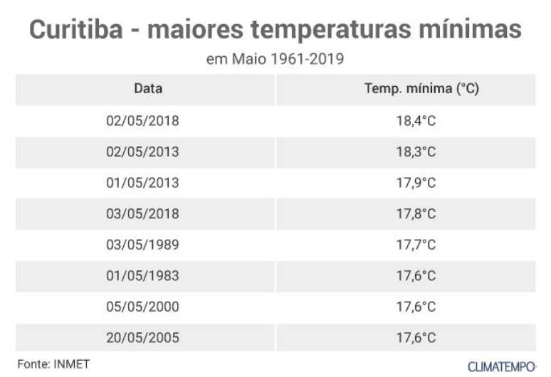 Em Curitiba, o calor deste início de maio está batendo recordes. Nesta segunda-feira, 6 de maio, a temperatura mínima foi de 19,2°C . Foi a maior mínima para um dia de maio desde 2002, portanto em 17 anos de medições. No sábado, 4 de maio, Curitiba teve a maior temperatura máxima este mês em 17 anos. O Instituto Nacional de Meteorologia registrou 29,9°C de temperatura máxima.