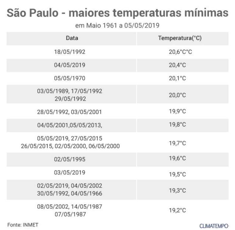 Em São Paulo, o Instituto Nacional de Meteorologia registrou 19,8°C de temperatura mínima, valor que está entre entre os seis maiores para um dia maio, para o período entre 1961 a 2019.