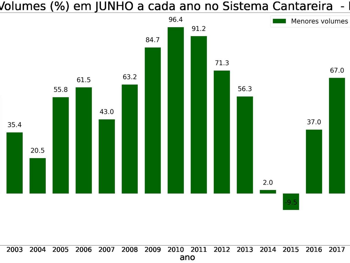 Foram 629,9mm entre janeiro e às 9 horas do dia 14 de junho, no sistema Cantareira, sendo até o momento o maior volume de chuva entre janeiro e junho dos últimos 2 anos. Mesmo assim, o Cantareira está abaixo da sua climatologia (856,2mm) nesse período, de janeiro a junho. Ou seja, desde 2016 o volume de chuva do primeiro semestre está abaixo da sua média no Cantareira.
