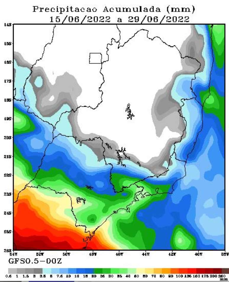 Acumulado de chuva previsto entre os dias 15/06/2022 e 29/06/2022 no Brasil pelo modelo GFS (Global Forecast System). Fonte: Climatempo.