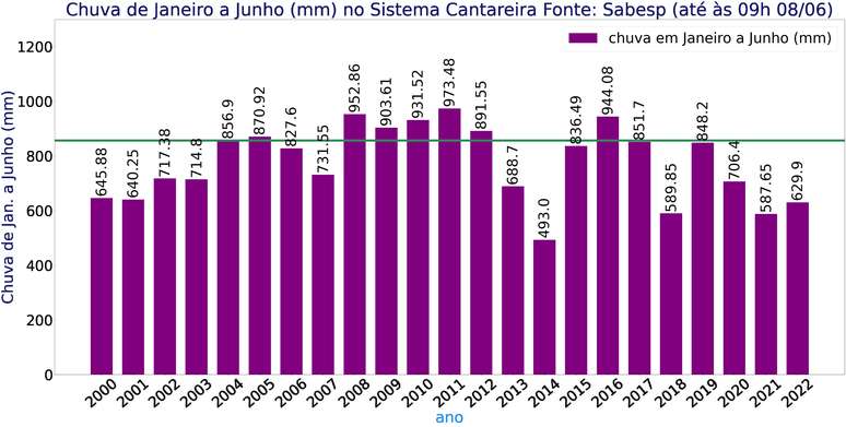 Acumulado de chuva entre os meses de janeiro e junho, dos últimos 23 anos. Fonte:Sabesp