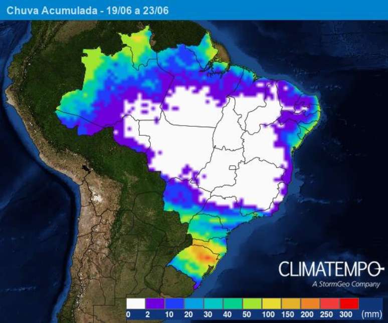 Acumulado de chuva previsto entre os dias 19/06/2022 e 23/06/2022 no Brasil pelo modelo GFS (Global Forecast System). Fonte: Climatempo.