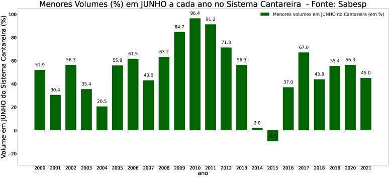 Menores níveis do sistema cantareira para um mês de junho, entre os anos 2000 e 2021. Fonte:Sabesp