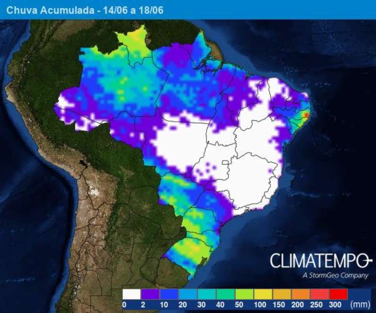 Acumulado de chuva previsto entre os dias 14/06/2022 e 18/06/2022 no Brasil pelo modelo GFS (Global Forecast System). Fonte: Climatempo.