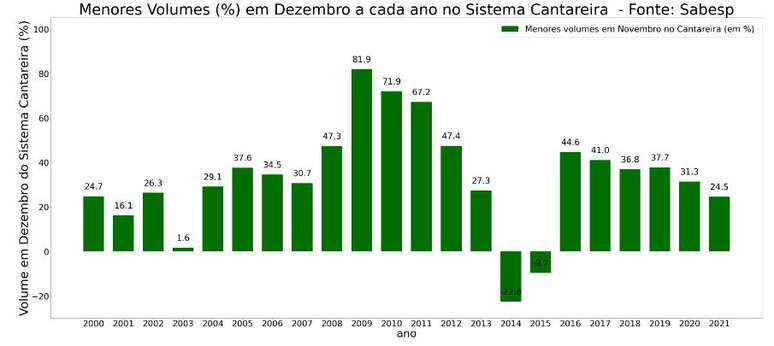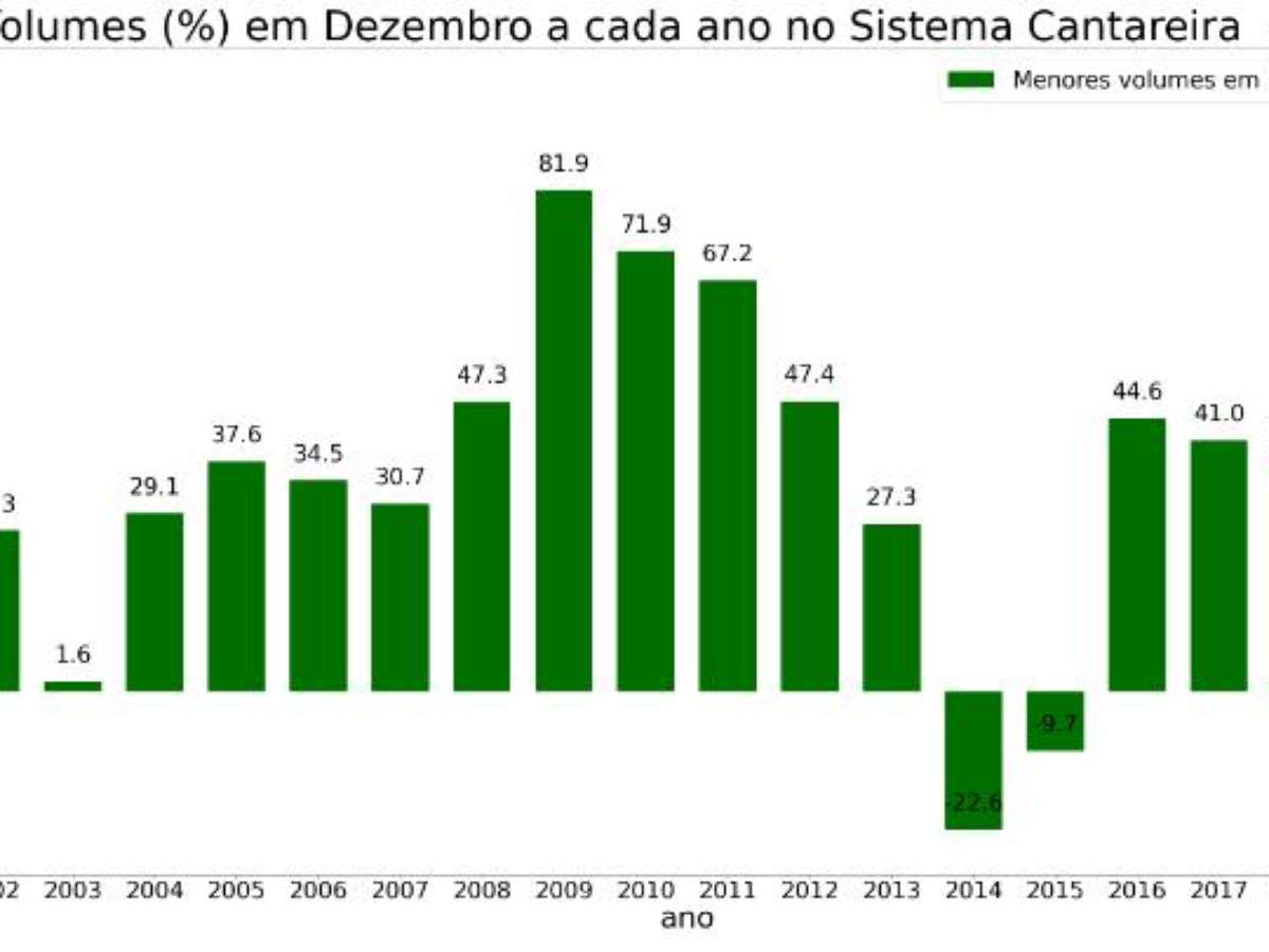 Menores volumes (%) em dezembro nos meses de dezembro no Cantareira, desde 2000. Fonte: Sabesp