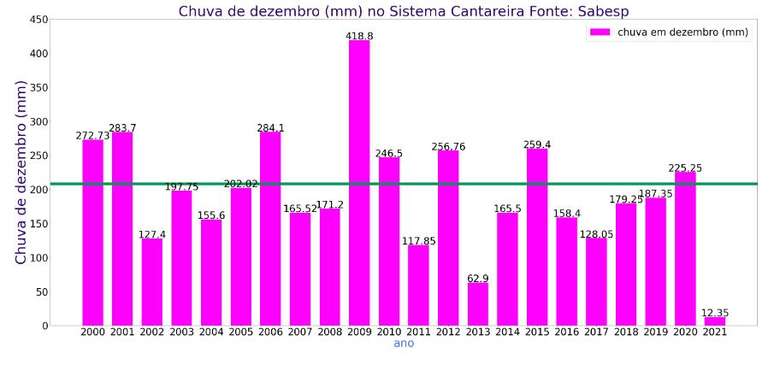 Acumulados de chuva nos meses de dezembro no Cantareira, desde 2000. Fonte: Sabesp