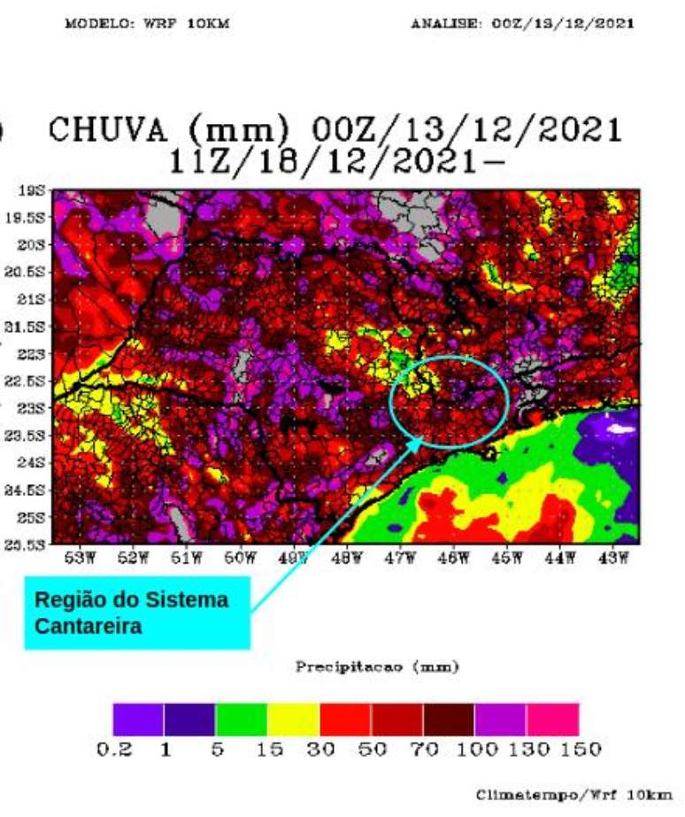 Previsão de acumulado de chuva entre o dia 13/12 e manhã de 18/12/2021 no estado de SP, parte de MG e do RJ. Modelo numérico WRF (Weather Research and Forecasting Model)