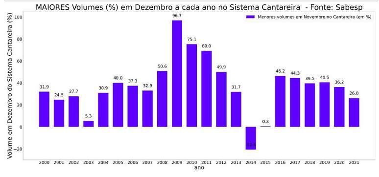 Maiores volumes (%) em dezembro nos meses de dezembro no Cantareira, desde 2000. Fonte: Sabesp