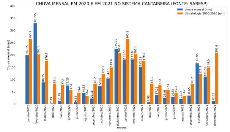 Chuva mensal no Sistema Cantareira nos anos de 2020 e 2021
