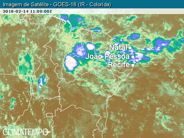 Animação das imagens de satélite mostra as nuvens carregadas que avançaram do mar em direção ao litoral do Rio Grande do Norte, da Paraíba e de Pernambuco.
