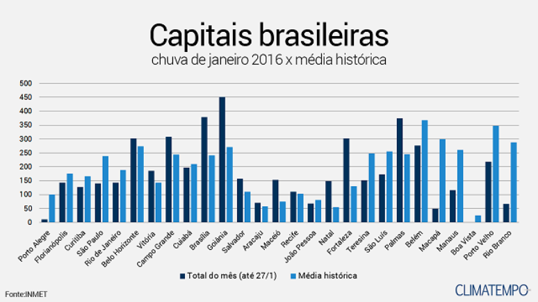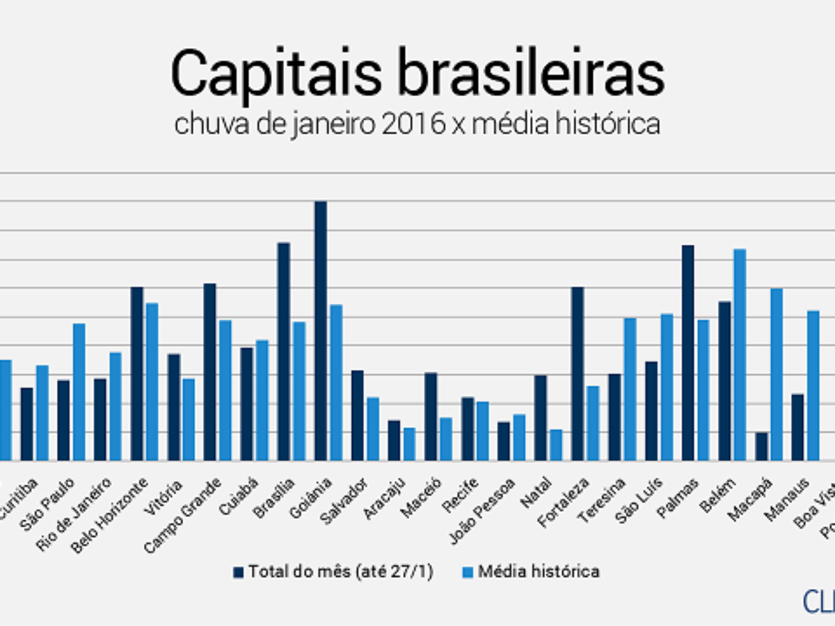 Já em Fortaleza, Natal, Goiânia e em Brasília, a chuva de janeiro de 2016 surpreende porque está muito acima da média.