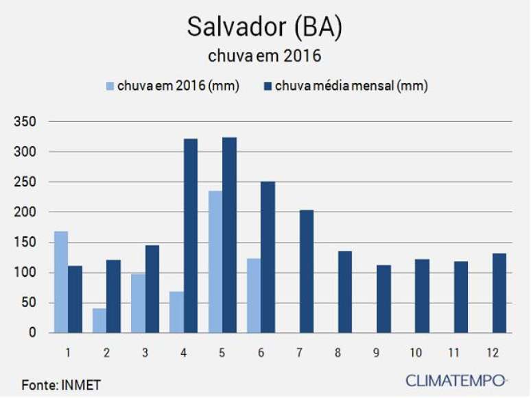Junho será outro mês em que a capital da Bahia terá chuva abaixo do normal. Pelas medições do Instituto Nacional de Meteorologia, do início do ano até agora, choveu mais do que a média mensal histórica apenas em janeiro. Porém, janeiro é época de pouca chuva. A chuva que refaz as reservas de água na região de é a chuva de outono/inverno, de abril a julho, que são os meses normalmente mais chuvosos do ano.