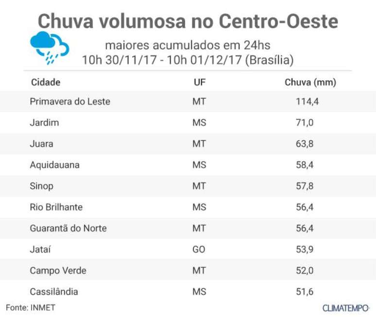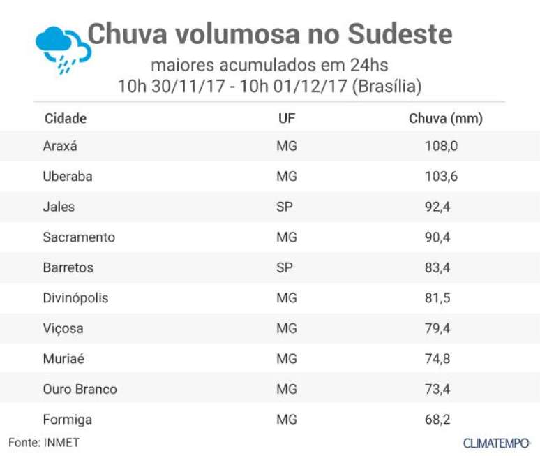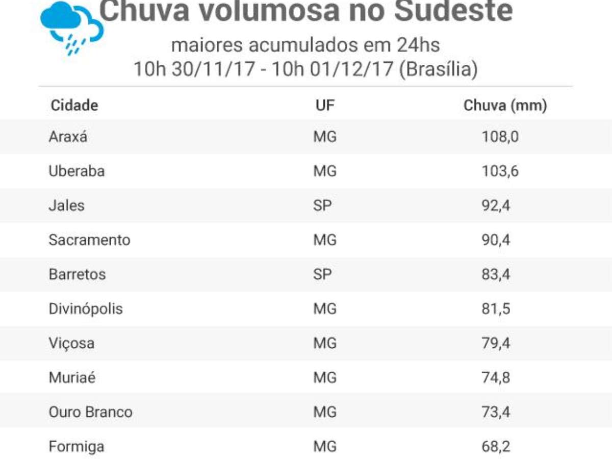 Confira os 10 maiores volumes de chuva registrados no Centro-Oeste e Sudeste entre 10 horas do dia 30/11/17 a 10 horas do dia 1/11/17. Em Araxá e em Uberaba, o acumulado de 24 horas foi mais de um terço da média de chuva normal para dezembro.