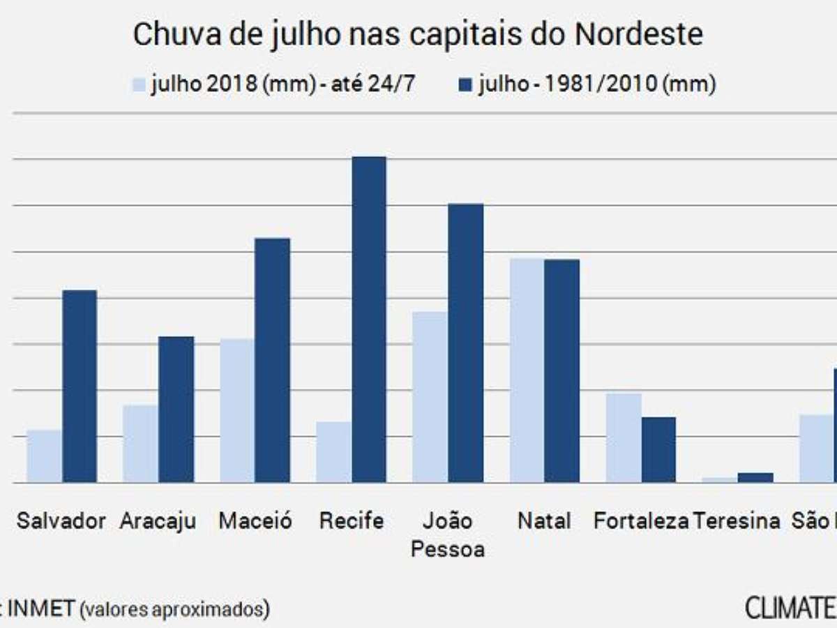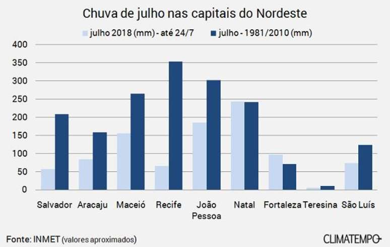 Só para se ter uma ideia, Natal é a única capital da Região Nordeste que já está com o nível de chuva dentro da normalidade para o mês de julho, enquanto Recife é uma das que está com menor acumulado de chuva até agora.