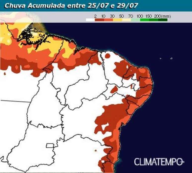 Repare no mapa abaixo que somente as áreas próximas ao litoral poderão acumular volumes de chuva entre 2 e 30 milímetros.