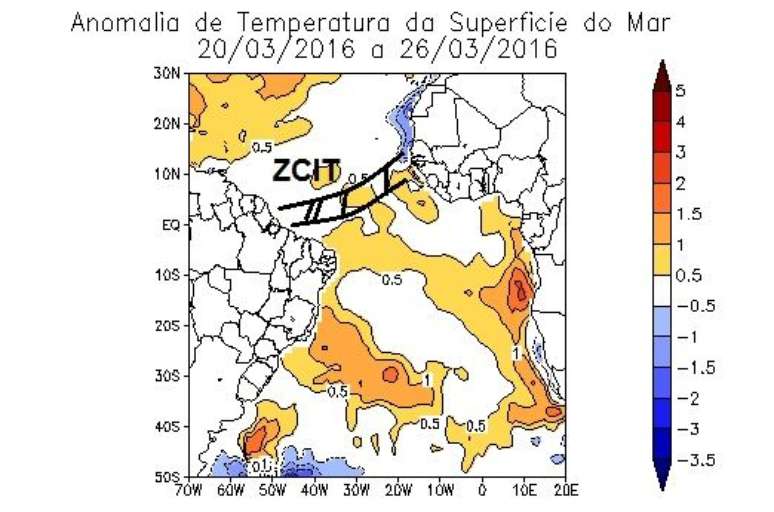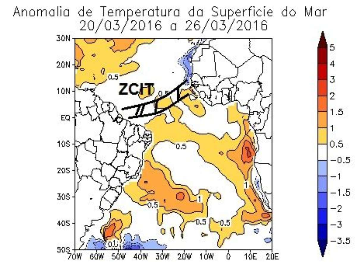 A Zona de Convergência Intertropical está bem organizada sobre o norte do nosso país, desde a segunda quinzena de março. Com isso, a chuva que vinha ficando abaixo da normalidade voltou a se aproximar do normal para esta época do ano. As águas do Atlântico se mantinham mais frias no Atlântico Tropical Sul em relação ao Atlântico Tropical Norte e essa configuração do dipolo fazia com que a ZCIT ficasse mais ao norte do que o normal, dificultando a chuva forte no litoral norte do Nordeste. Mas estas situação mudou, como podemos ver na imagem da TSM abaixo (fonte Cptec) e a ZCIT está em cima do Brasil.