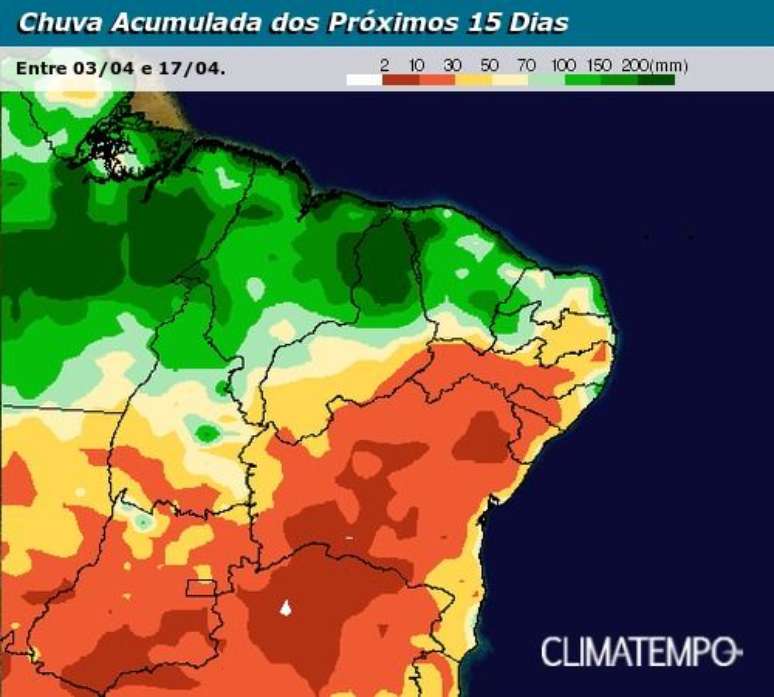 Em fortaleza já choveu aproximadamente 140mm desde que começou o mês, sendo que no último dia de março houve registro de 100mm de chuva. Mesmo assim, março terminou com déficit de 20% em relação à média (que é de 339mm para março). Agora em abril a média é de 348mm e, pelo que podemos observar no mapa dos próximos quinze dias (ainda faltará quase toda a segunda quinzena), poderemos atingir este patamar.