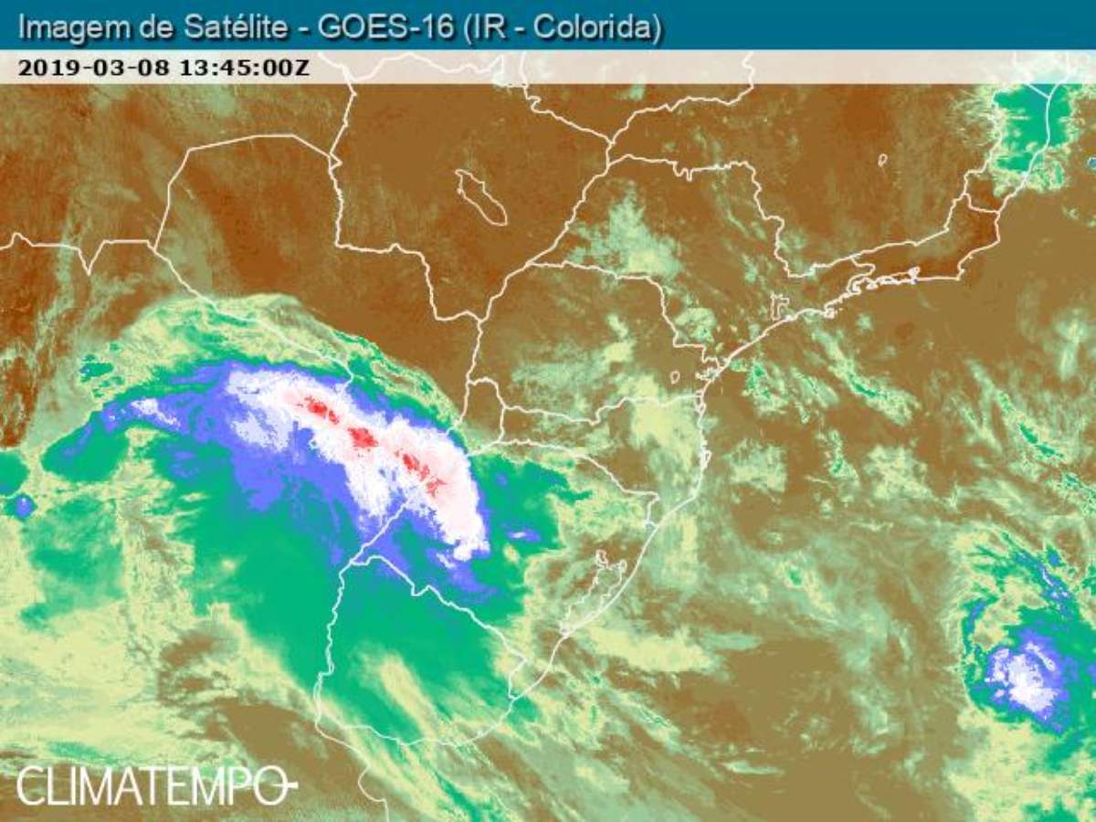 Imagem de satélite mostra fortes áreas de instabilidade sobre o interior do Rio Grande do Sul.