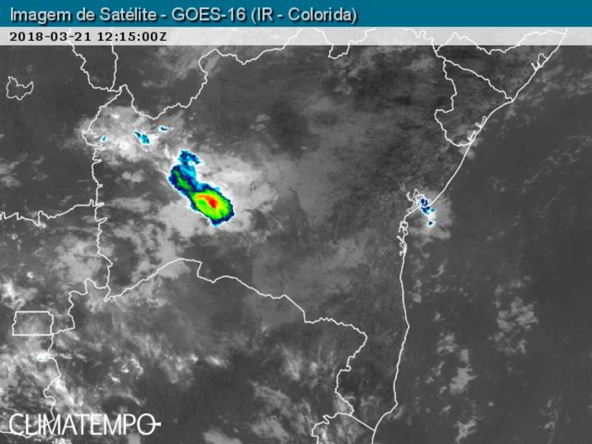 Na imagem captada pelo satélite GOES 16 é possível ver nuvens carregadas (mancas azuladas) exatamente sobre Salvador. Repare que não há nenhum grande aglomerado de chuva na região do litoral da Bahia.