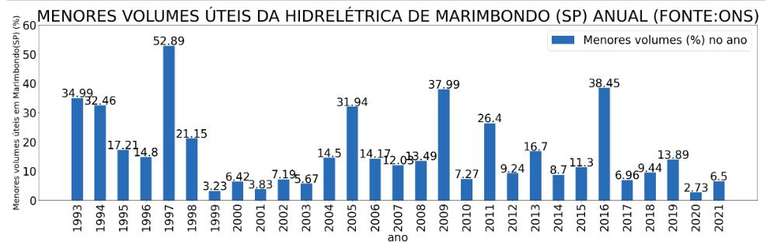 O menor nível na usina Marimbondo este ano foi de 6,5% no dia 1 de junho de 2021, e chegou aos 16,02% no dia 24 de outubro de 2021. Como nesses últimos dias a chuva está mais isolada, teve uma pequena queda, e foi para os 14,79% no dia 27 outubro de 2021.