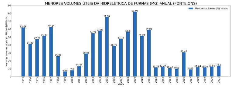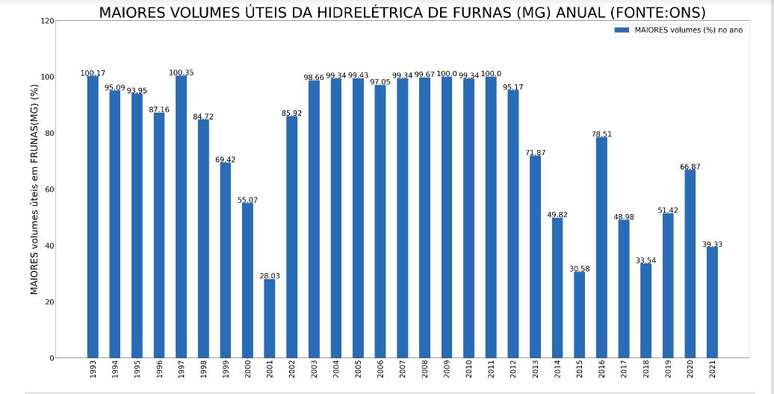 Segundo dados da ONS (Operador Nacional do Sistema Elétrico) Furnas registrou o menor nível deste ano de 2021 nos dias 01 e 2 de outubro, com 13,60%. Com as chuvas que vêm ocorrendo de maneira mais regular pelo Sudeste e região central do país, ajudaram o nível dos reservatórios a subirem, chegando aos 17,22% em 27 de outubro de 2021. Um aumento de 3,62% entre o primeiro de outubro até o dia 27 do mesmo mês.