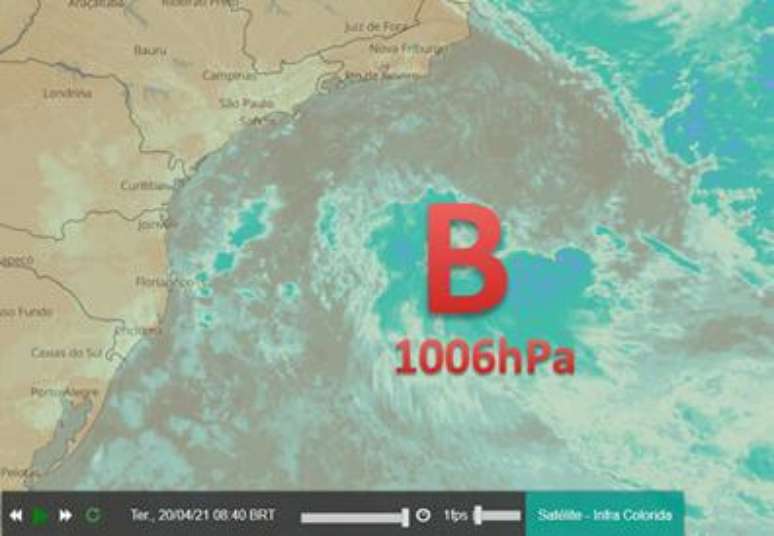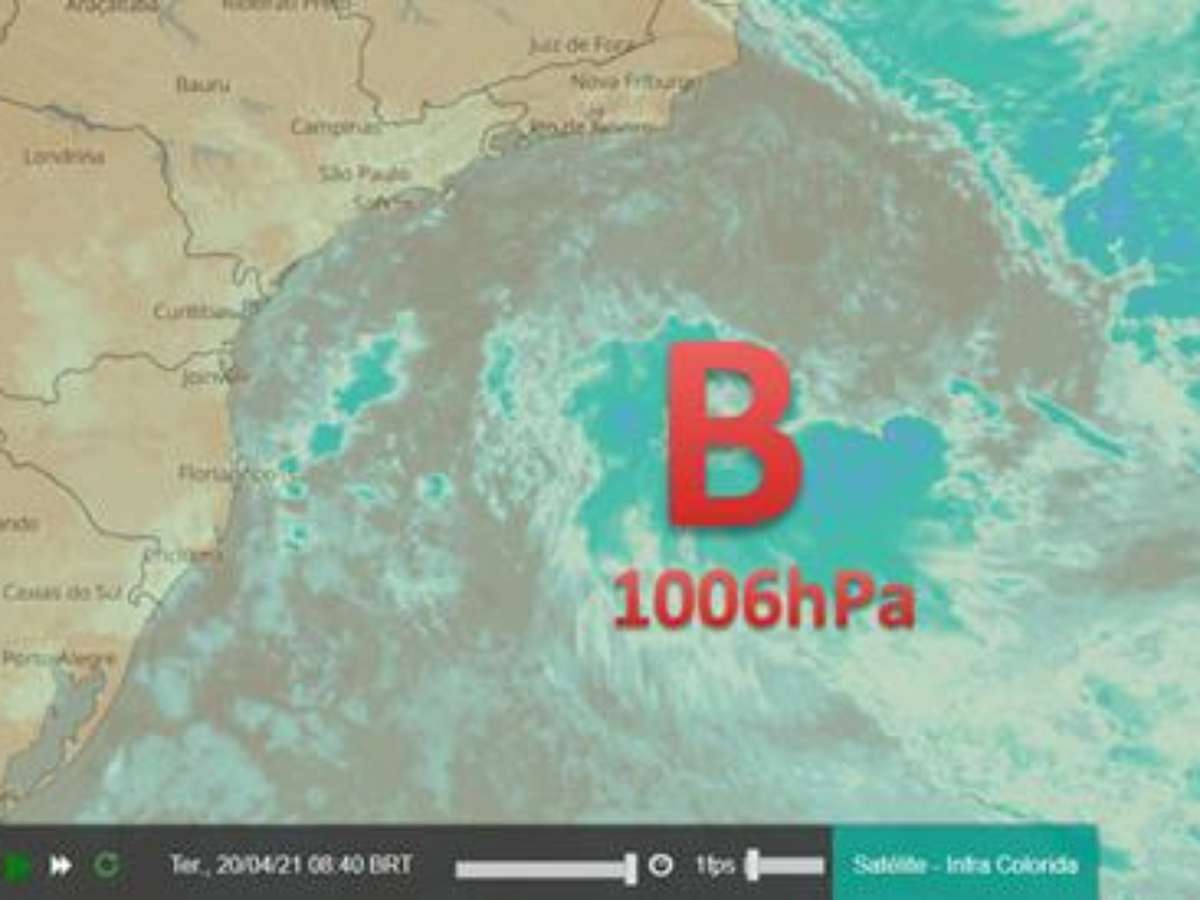Nessa terça-feira (20) pela manhã o centro de baixa pressão estava a cerca de 450km do litoral do RJ e cerca de 650km da costa de SC, com pressão estimada em 1006hPa, como indicado na imagem abaixo (GOES-16).