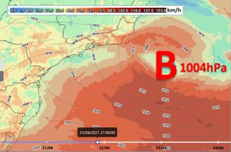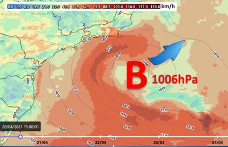 Entre a terça(20) e quarta-feira(21), o ciclone atua ao largo do Sudeste com deslocamento leste/nordeste como indicado nas figuras abaixo: