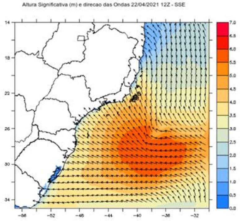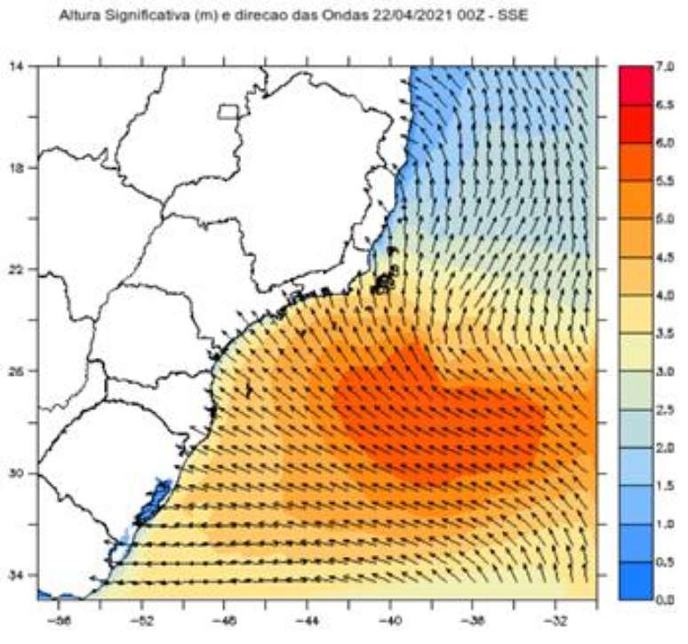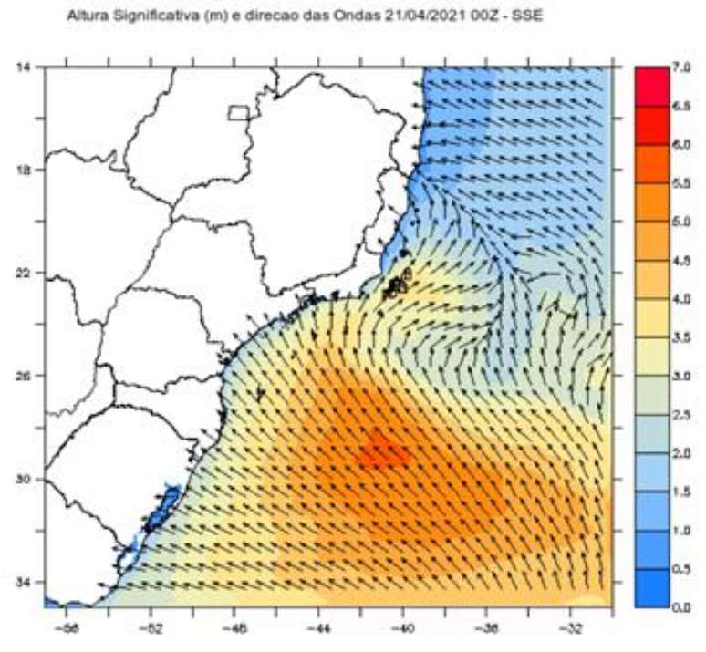 No decorrer da quarta-feira(21), o mar fica ainda mais agitado, com forte ressaca em todo o litoral entre o Rio Grande do Sul e o Rio de Janeiro. A altura das ondas chega a 4 metros nas praias fluminenses e fica entre 3 e 3,5 metros nas demais áreas costeiras. Em mar aberto a altura das ondas fica por volta de 6 metros. A ondulação do mar pode ser verificada no mapa abaixo que indica a previsão de altura de onda e ondulação na quarta-feira à noite.