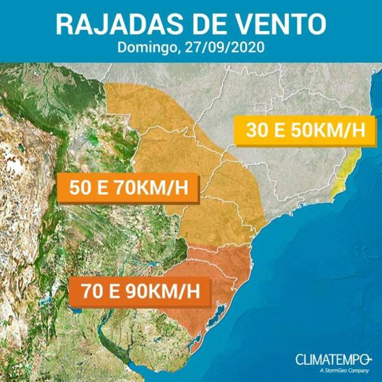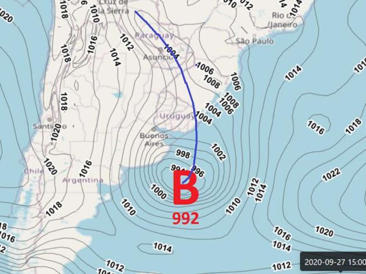 Entre domingo e segunda-feira, dias 27 e 28 de setembro, um sistema de baixa pressão irá se aprofundar no oceano, ao largo da costa da Argentina, e dará origem a um novo ciclone extratropical, que avançará para alto-mar ao largo da costa do Sul do Brasil. De acordo com os meteorologistas da Climatempo, este sistema provocará fortes rajadas de vento em áreas do centro-sul do Brasil, principalmente sobre sul e leste do Rio Grande do Sul.