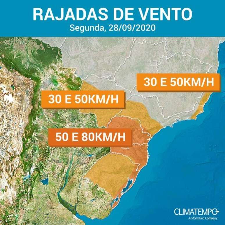 Na segunda-feira (28), as rajadas de vento se intensificam na parte da tarde entre São Paulo, Rio de Janeiro, Espírito Santo e Mato Grosso do Sul. Também venta forte em áreas do Sul do país.