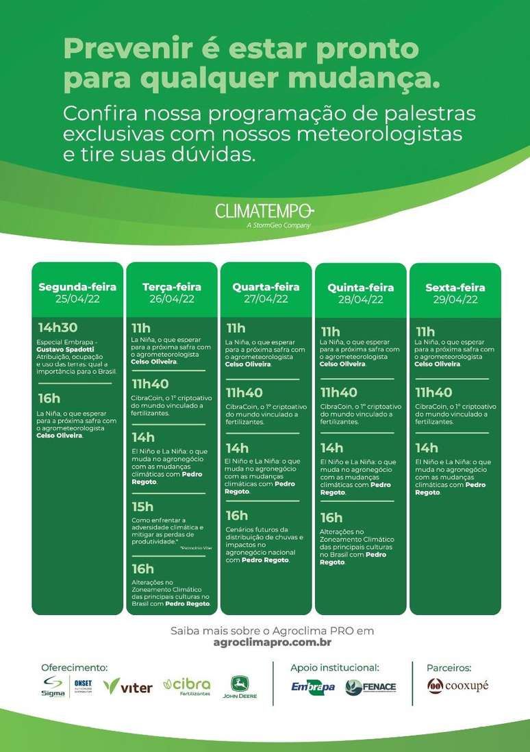 Para a feira a empresa preparou uma programação de palestras exclusivas com meteorologistas do mercado, que irão abordar as problemáticas climáticas atuais que mais afetam os produtores rurais e as suas respectivas lavouras. Você é nosso convidado. Confira abaixo a programação: