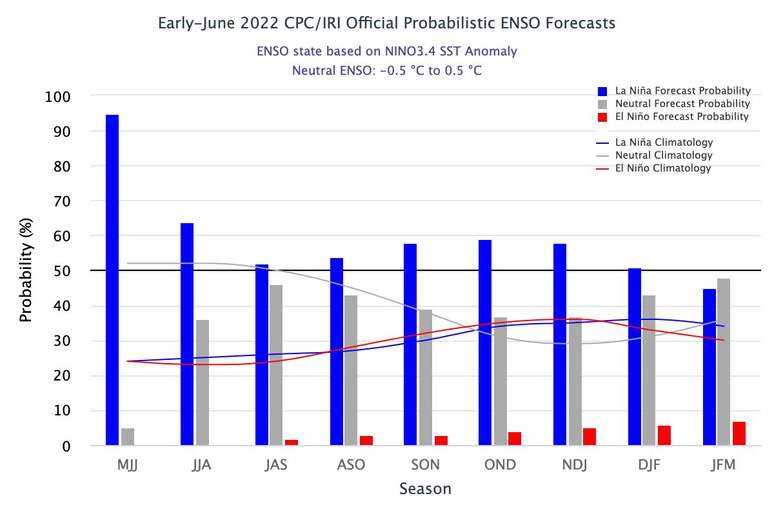 O Pacífico equatorial segue com águas mais frias que a média histórica neste mês de julho, caracterizando um evento de La Niña. E a La Nina continuará atuando nos próximos meses e enfraquecerá só no início de 2023.