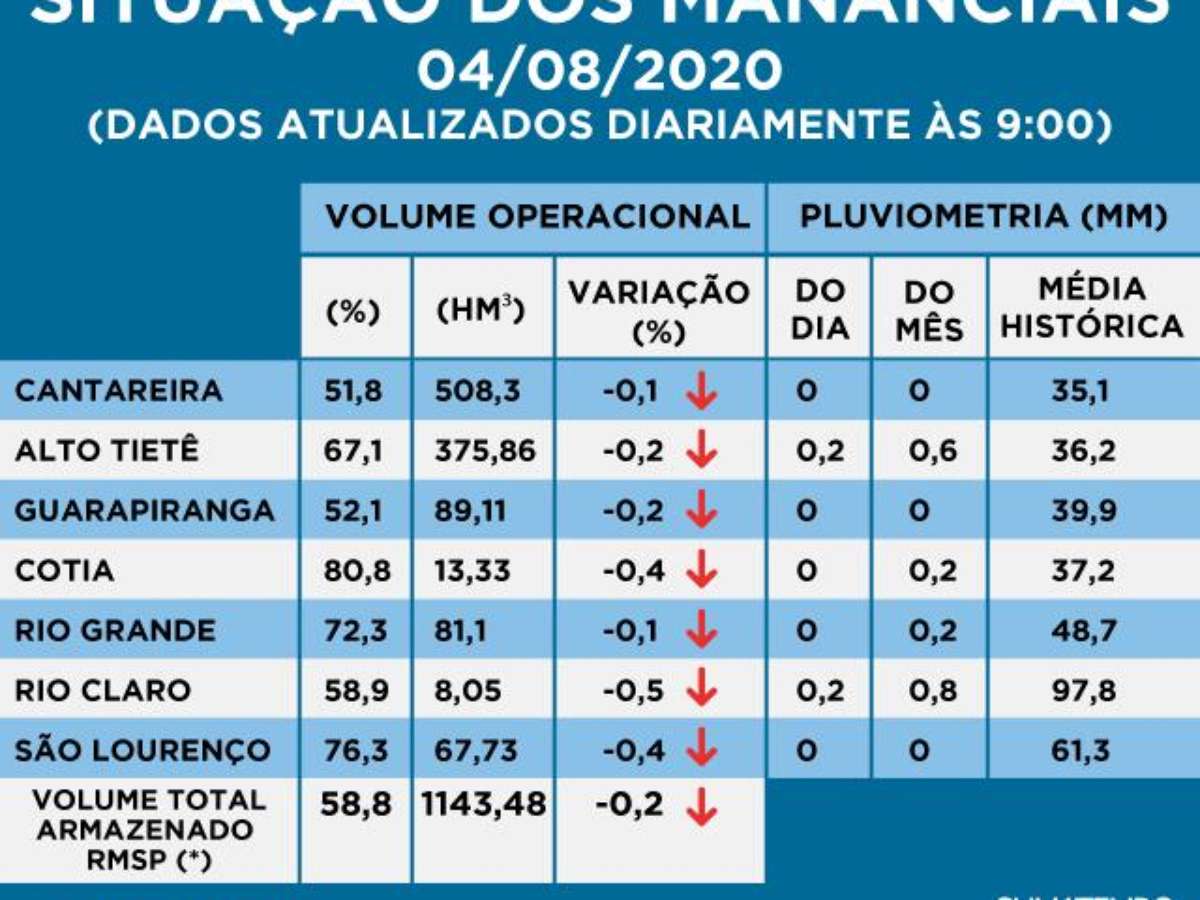 No dia 04 de agosto de 2014, o volume operacional do Sistema Cantareira era de -3,7%. Em 2015, ainda em crise, o volume era de apenas -10,9% no dia 04 de agosto.