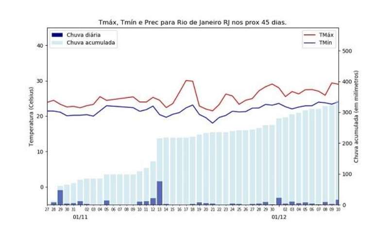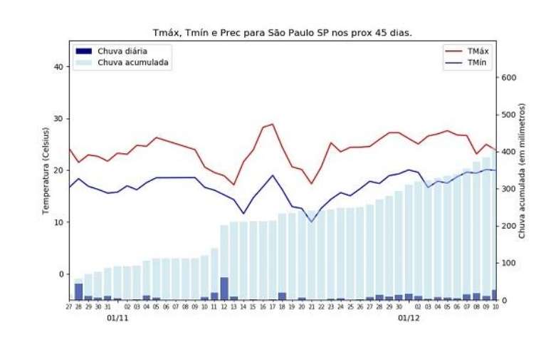 Confira abaixo os gráficos de temperatura e chuva previstas para os próximos 45 dias nos dois estados.