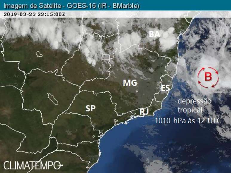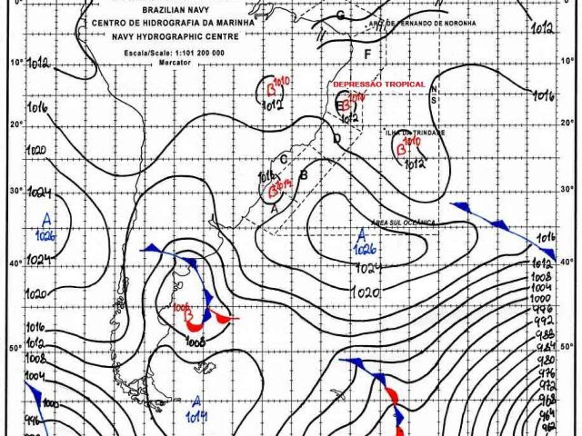 Na carta meteorológica da Marinha das 16 UTC (13 horas, em Brasília), a depressão tropical aparece indicada sobre o litoral da Bahia e do Espírito Santo, com a letra B (de baixa pressão), com mínimo de 1010 hPa.