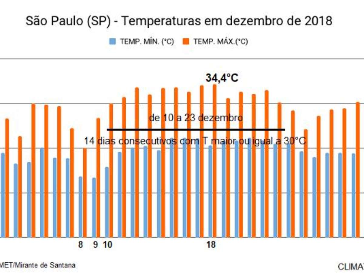 No período entre 10 e 23 dezembro de 2018, a temperatura máxima na cidade de São Paulo foi igual ou maior do que 30°C, totalizando 14 dias consecutivos nesta situação. Este foi o período mais quente de 2018 na capital paulista. Nenhum outro mês do ano, nem no verão, teve tantos dias seguidos com calor de 30°C ou mais.