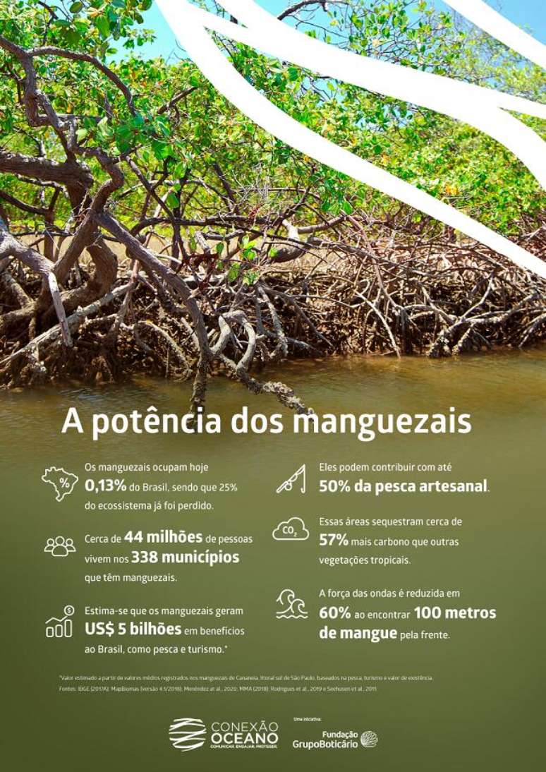 "Em algumas localidades, os manguezais contribuem com até 50% da pesca artesanal, alimentando o ciclo de vida de espécies marinhas de grande valor comercial, como robalos, tainhas, siris, ostras e caranguejos. Por suas paisagens únicas, o turismo é outra atividade que se beneficia desses ecossistemas", explica Emerson Oliveira, gerente de Conservação da Biodiversidade da Fundação Grupo Boticário de Proteção à Natureza.