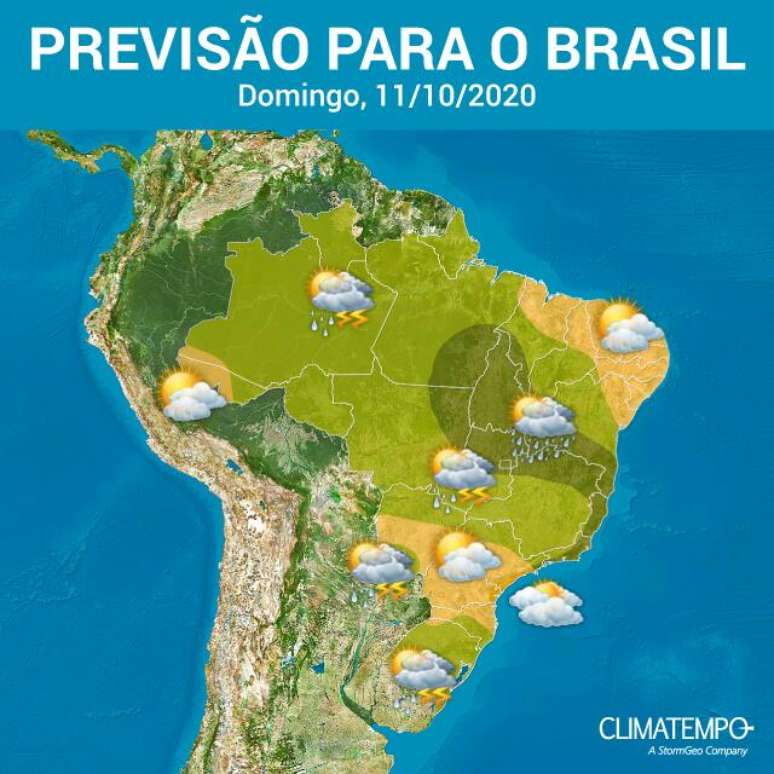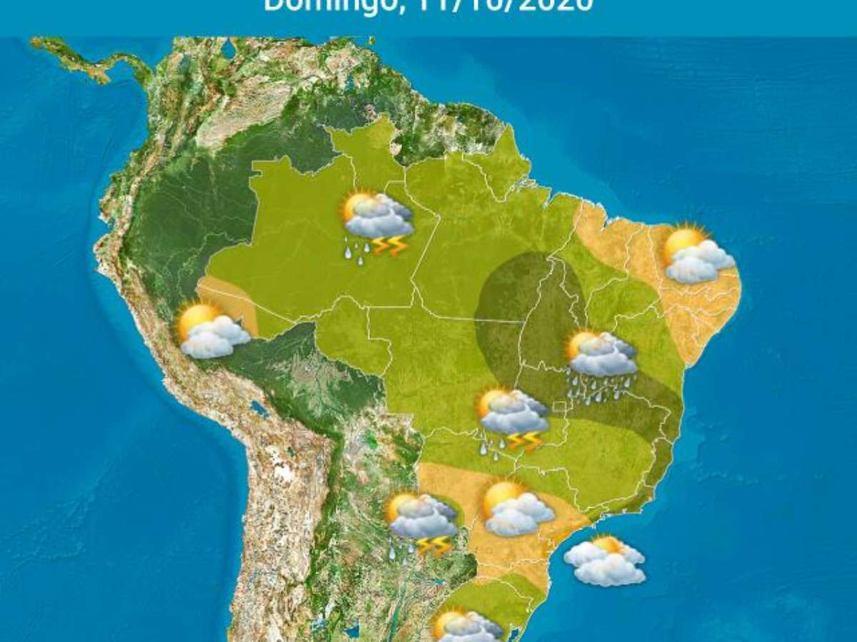 O domingo será marcado por muita nebulosidade no litoral do Paraná e de São Paulo e em toda costa fluminense e capixaba até o sul da Bahia por conta da atuação de ventos úmidos soprando do mar sobre a costa. Por outro lado, uma massa de ar mais seco deixa o tempo aberto nas demais áreas paranaenses, no norte de Santa Catarina e no sul e oeste de São Paulo. No Rio Grande do Sul, podem ocorrer chuvas isoladas no fim do dia devido ao avanço de um sistema de baixa pressão pelo Uruguai. Já no Nordeste, o predomínio será de tempo seco, com exceção da Bahia, sul do Maranhão e do Piauí. As demais áreas do país, que compreendem praticamente todo o Norte, Centro-Oeste (exceto Mato Grosso do Sul) e Sudeste, o dia será de nebulosidade variável com pancadas de chuva no decorrer do dia. Pode chover forte entre a tarde e a noite em Mato Grosso, Tocantins, Goiás, oeste da Bahia e norte e oeste de Minas Gerais.