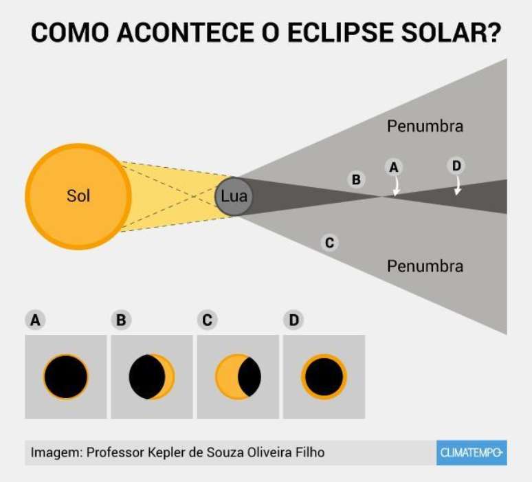 Veja no esquema abaixo como ocorre o eclipse. Em (A) e (D), que representam a faixa estreita em rosa escuro, a visibilidade do evento é total, do começo ao fim. Nas outras faixas, que estão em outros tons de rosa, e que inclui parte do Brasil, a visibilidade foi parcial como em (B) ou (D).