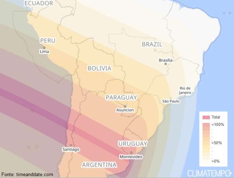 Áreas de visibilidade do eclipse solar total de 2/7/2019