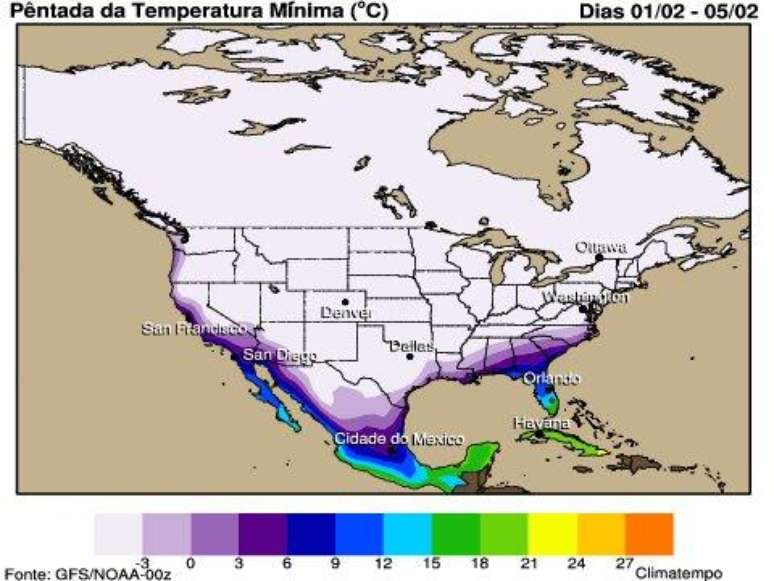 O frio tomará conta dos Estados Unidos e a previsão é de temperaturas mínimas negativas até o estado do Texas, Virgínia e as Carolinas.