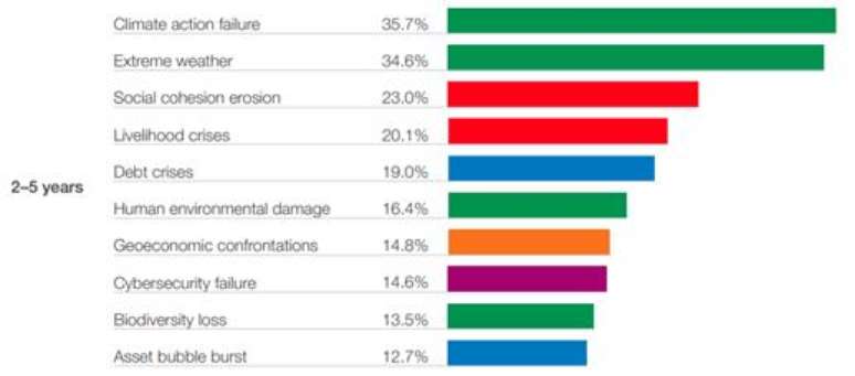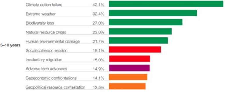 O esperado para o período de 5 a 10 anos é de que as maiores crises devam ser de fato ambientais. Falhas das ações climáticas, eventos extremos e perda de biodiversidade, seguem em primeiro lugar, com 42.1%, 32.4% e 27% respectivamente. Entretanto, em um cenário mais longo, aparecem na lista a crise dos recursos naturais e os danos do homem ao meio ambiente 23% e 21.7%, respectivamente.