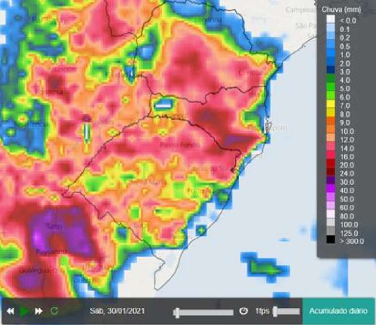 No sábado, os temporais se espalham pelo Sul. Apesar de fortes, a previsão é de que não acumulem grandes volumes de chuva como indicado abaixo:
